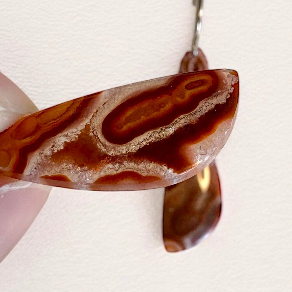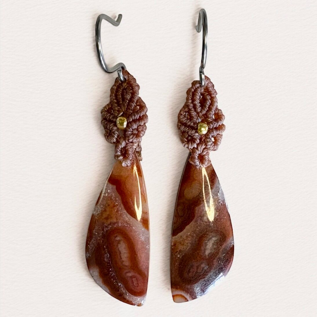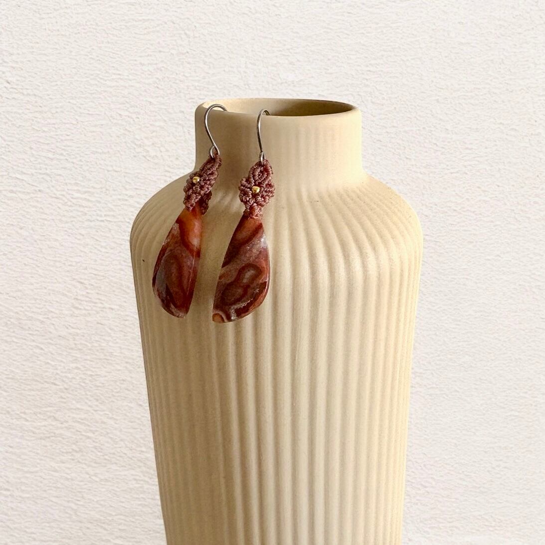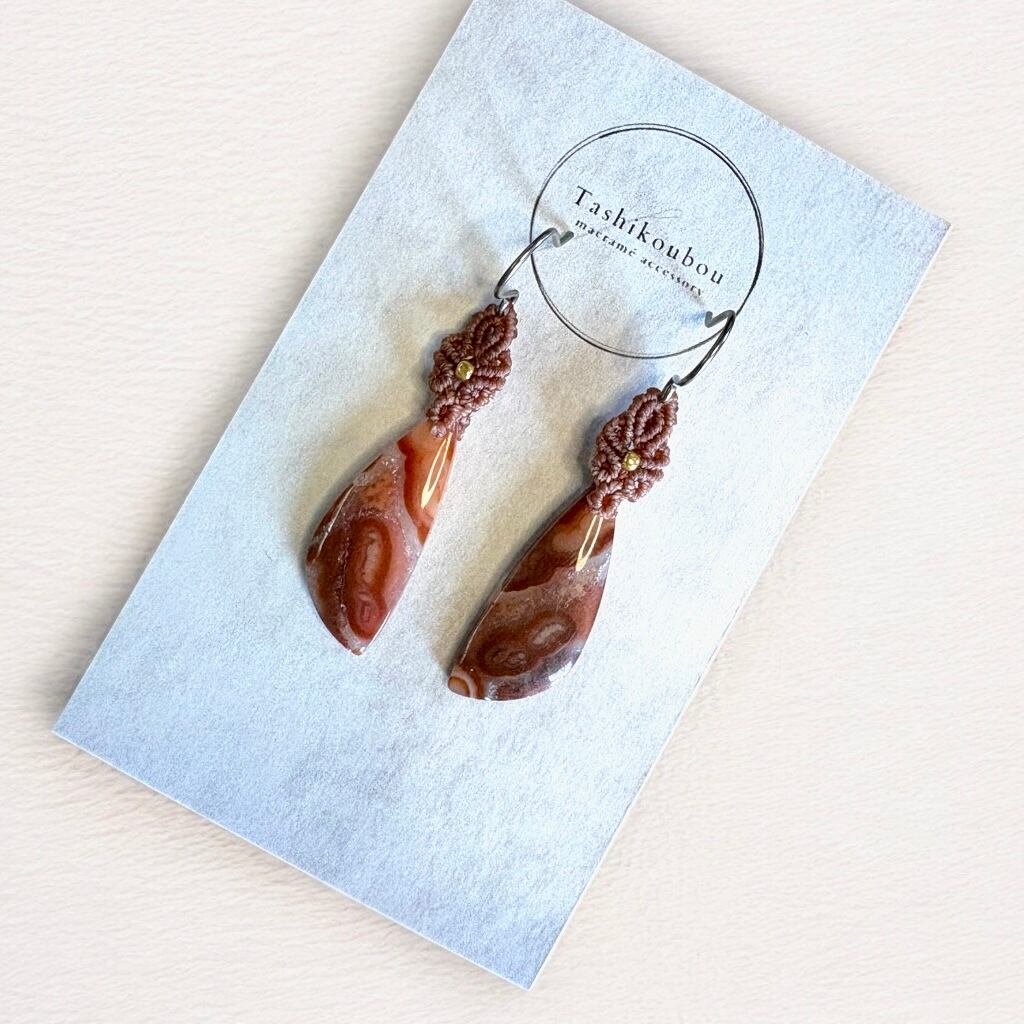 やわらかな光沢と深みのある模様が魅力の「チューブアゲート」を使った、マクラメピアスです。