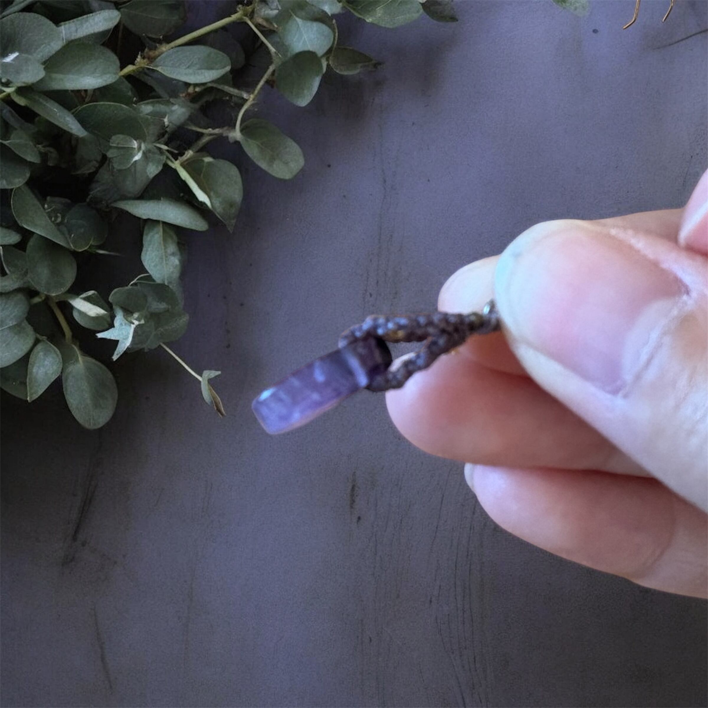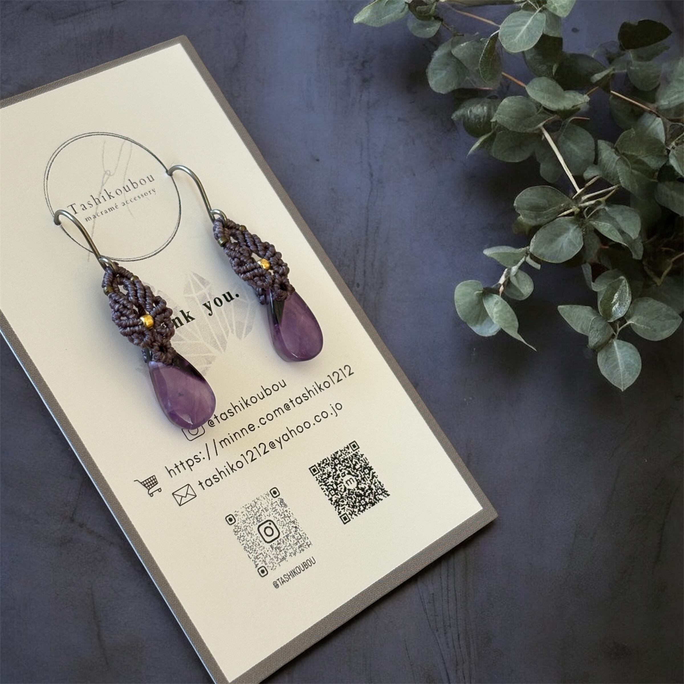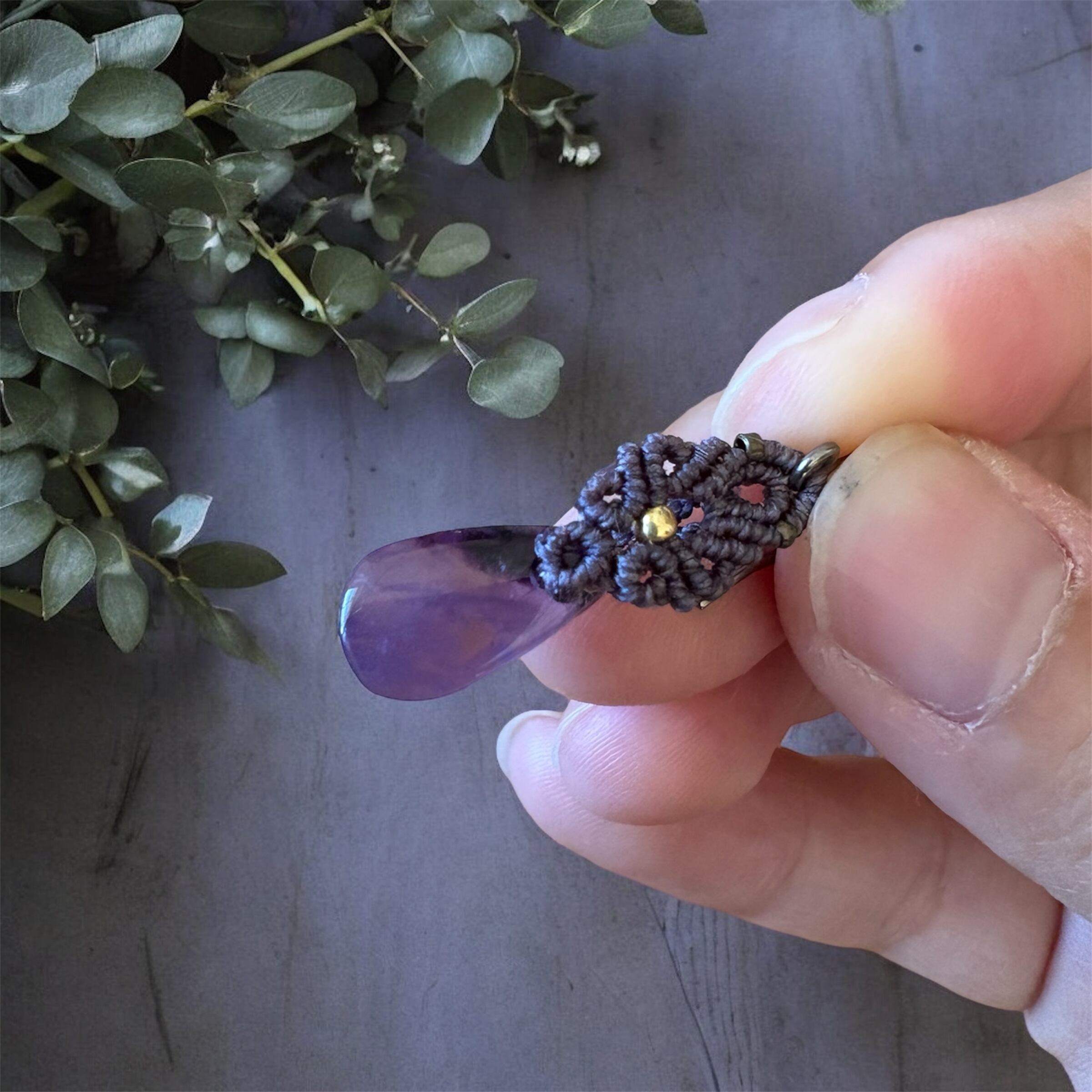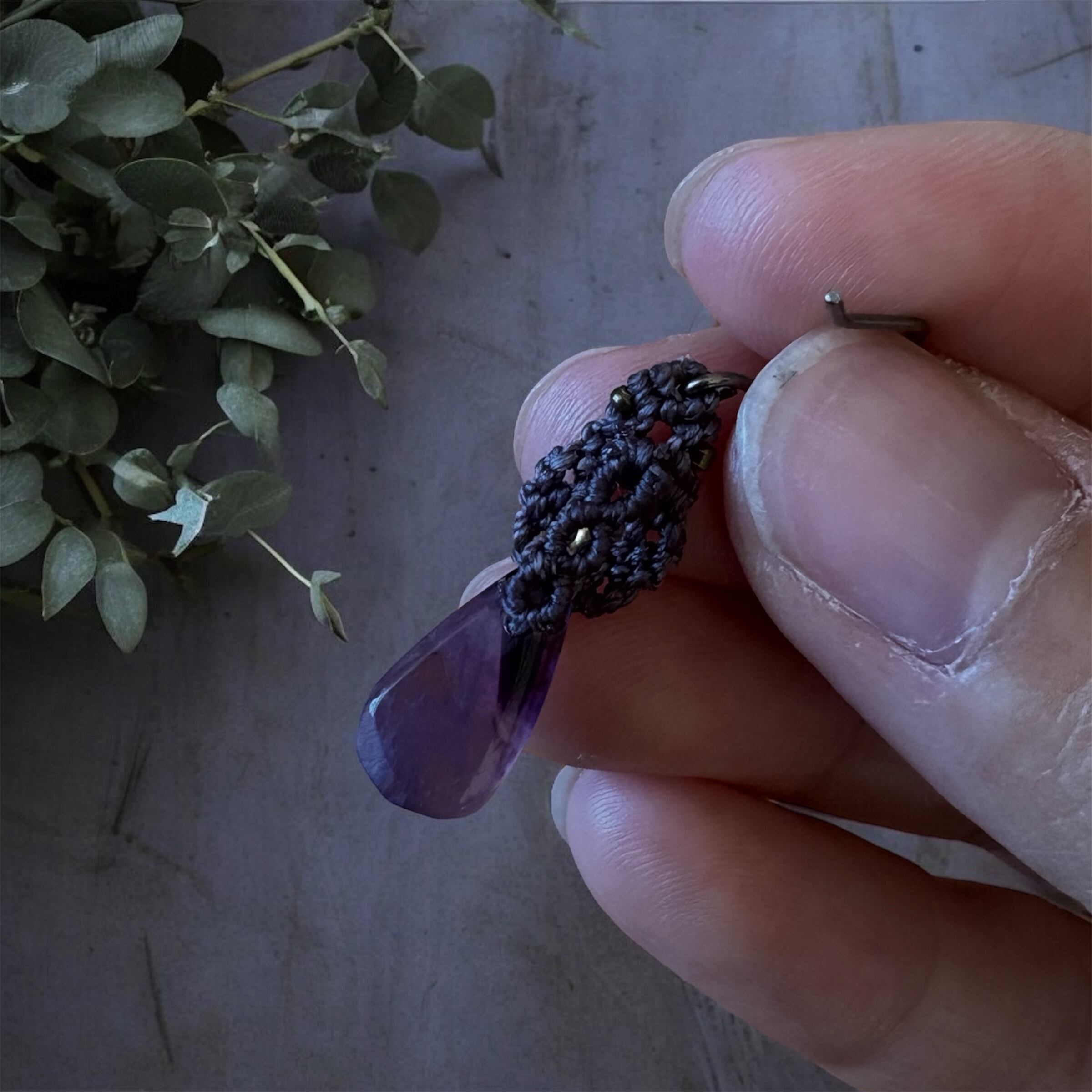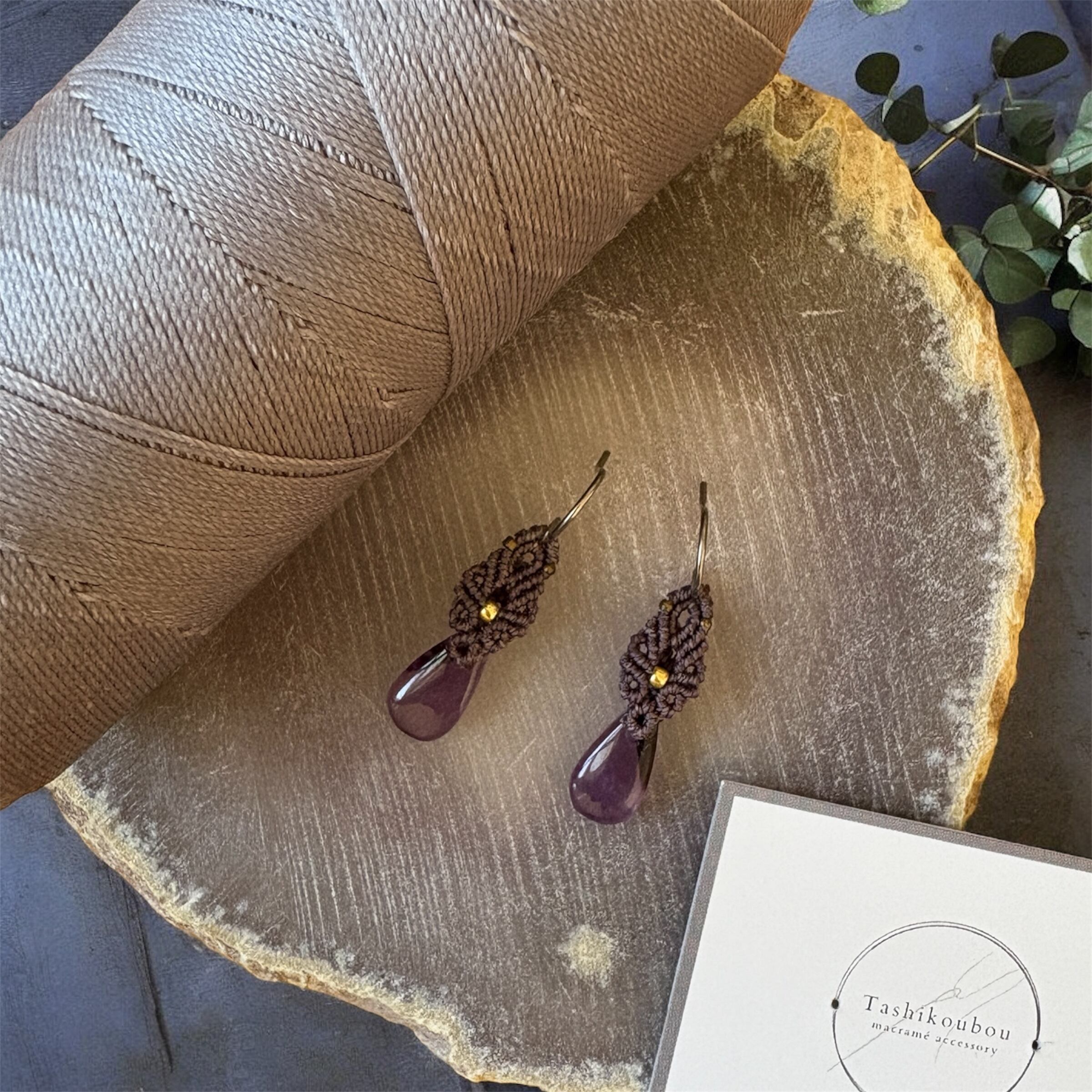 スモーキーバイオレットのマクラメコードで結びました