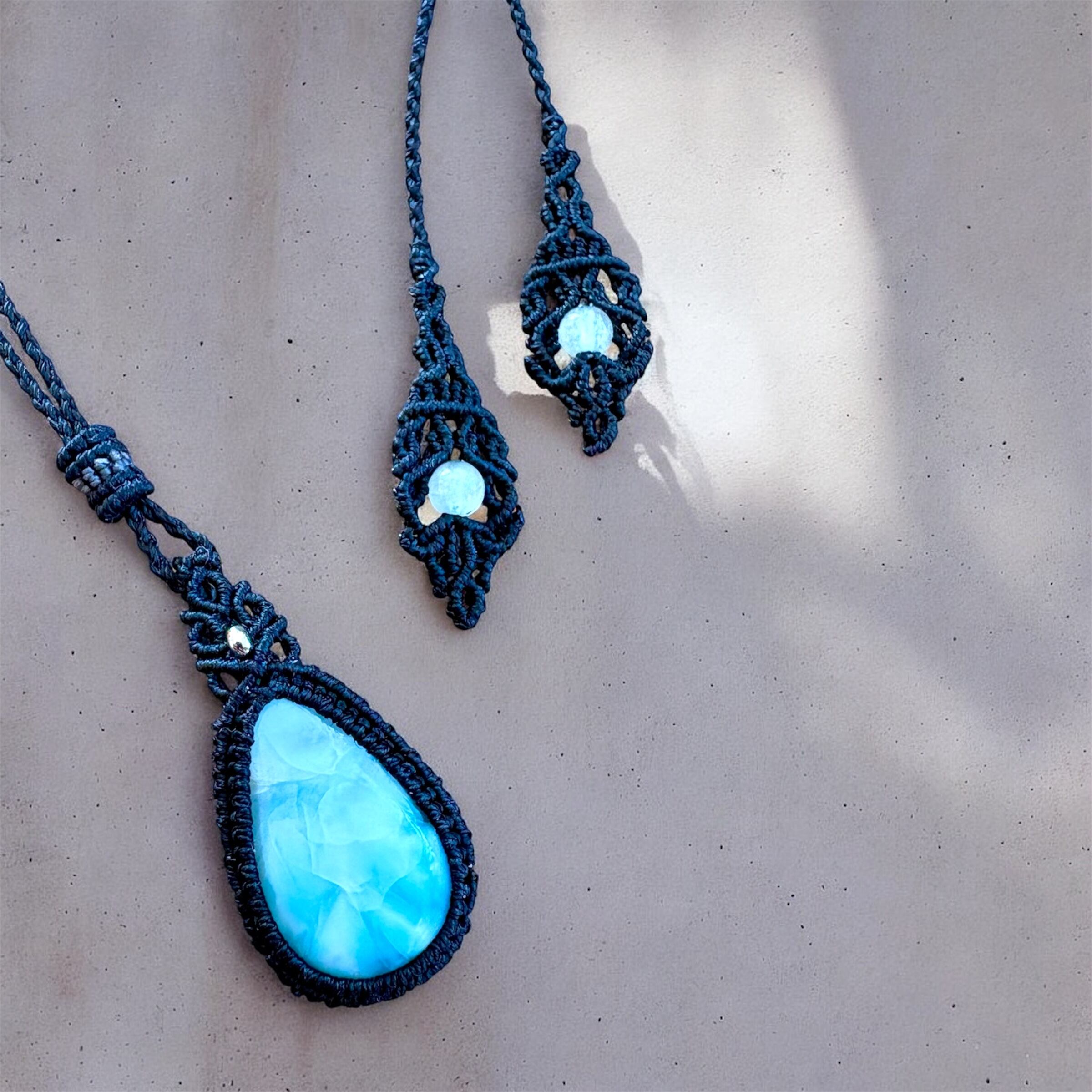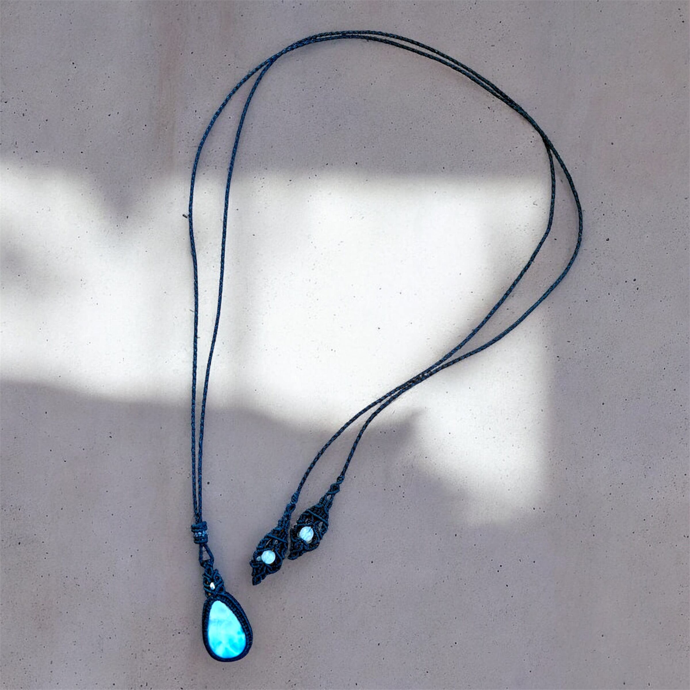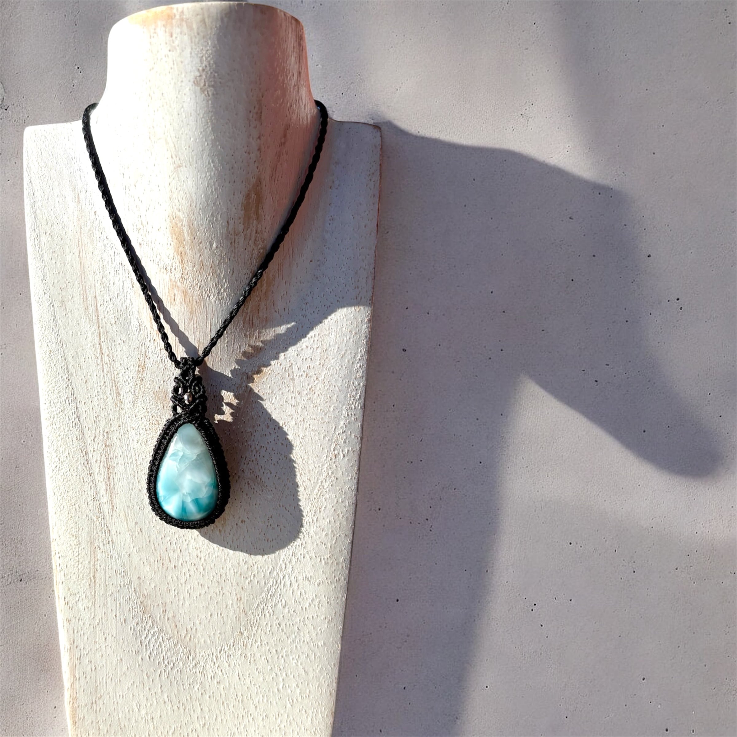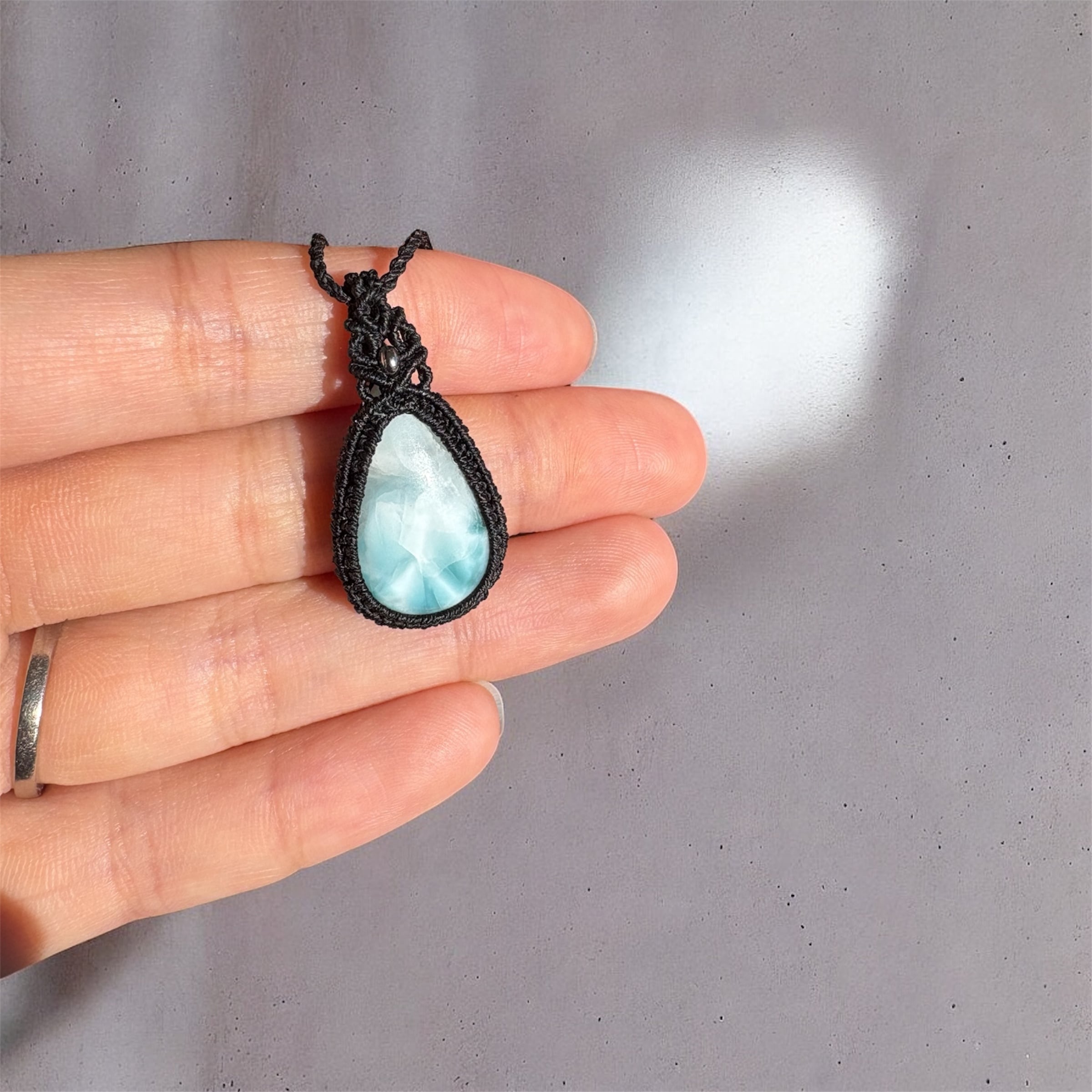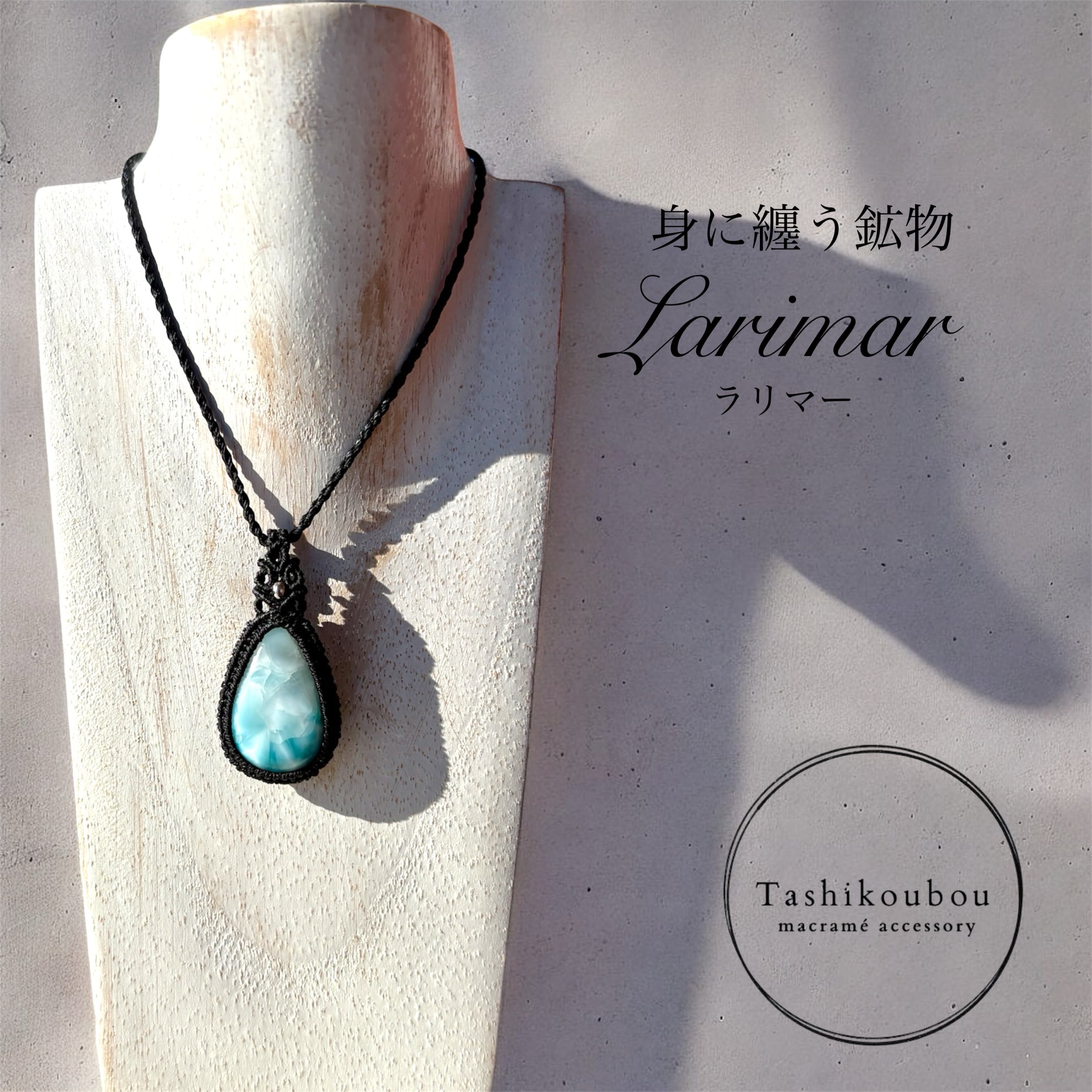 落ち着いたブラックコードが、ラリマーの透明感と色味をより一層引き立てます。