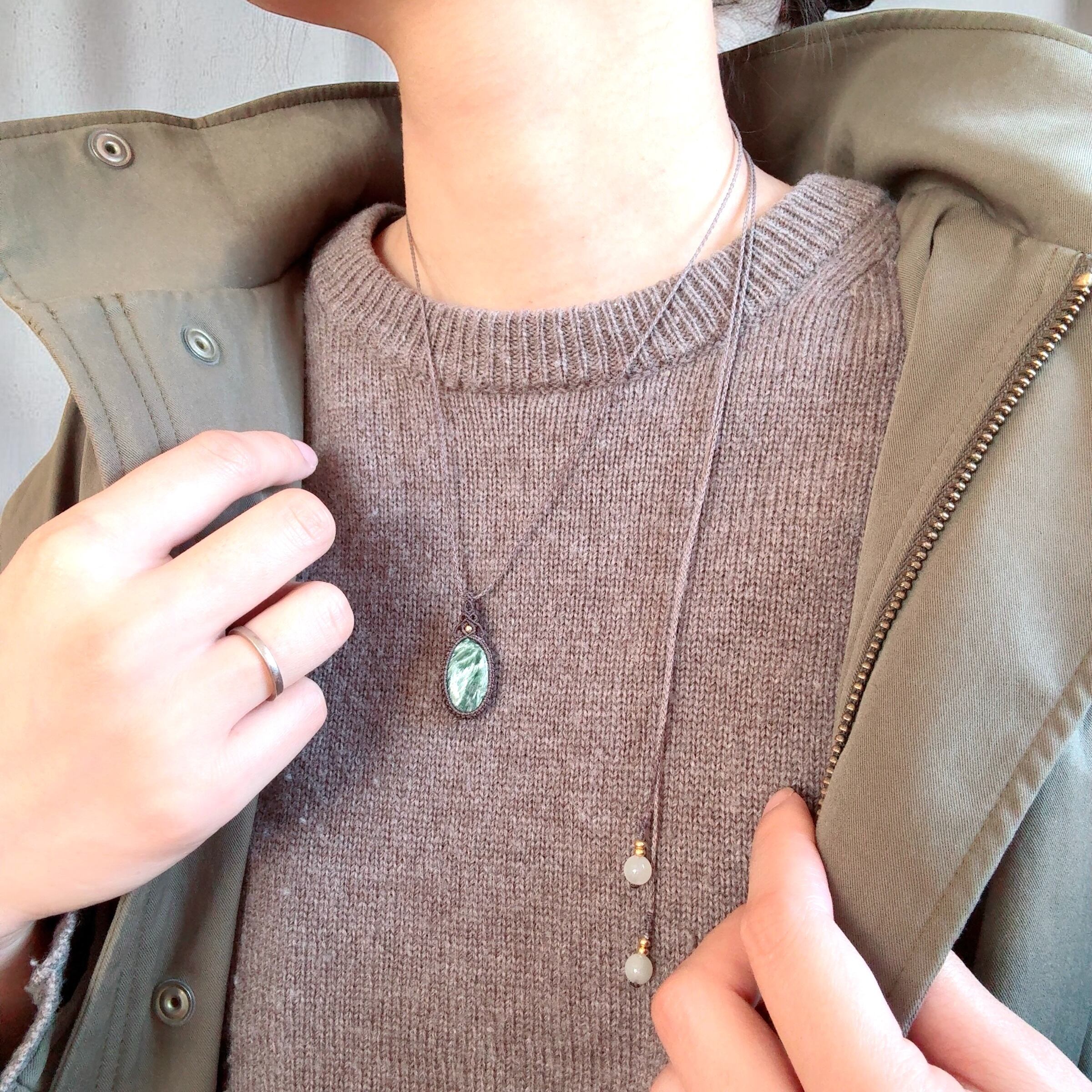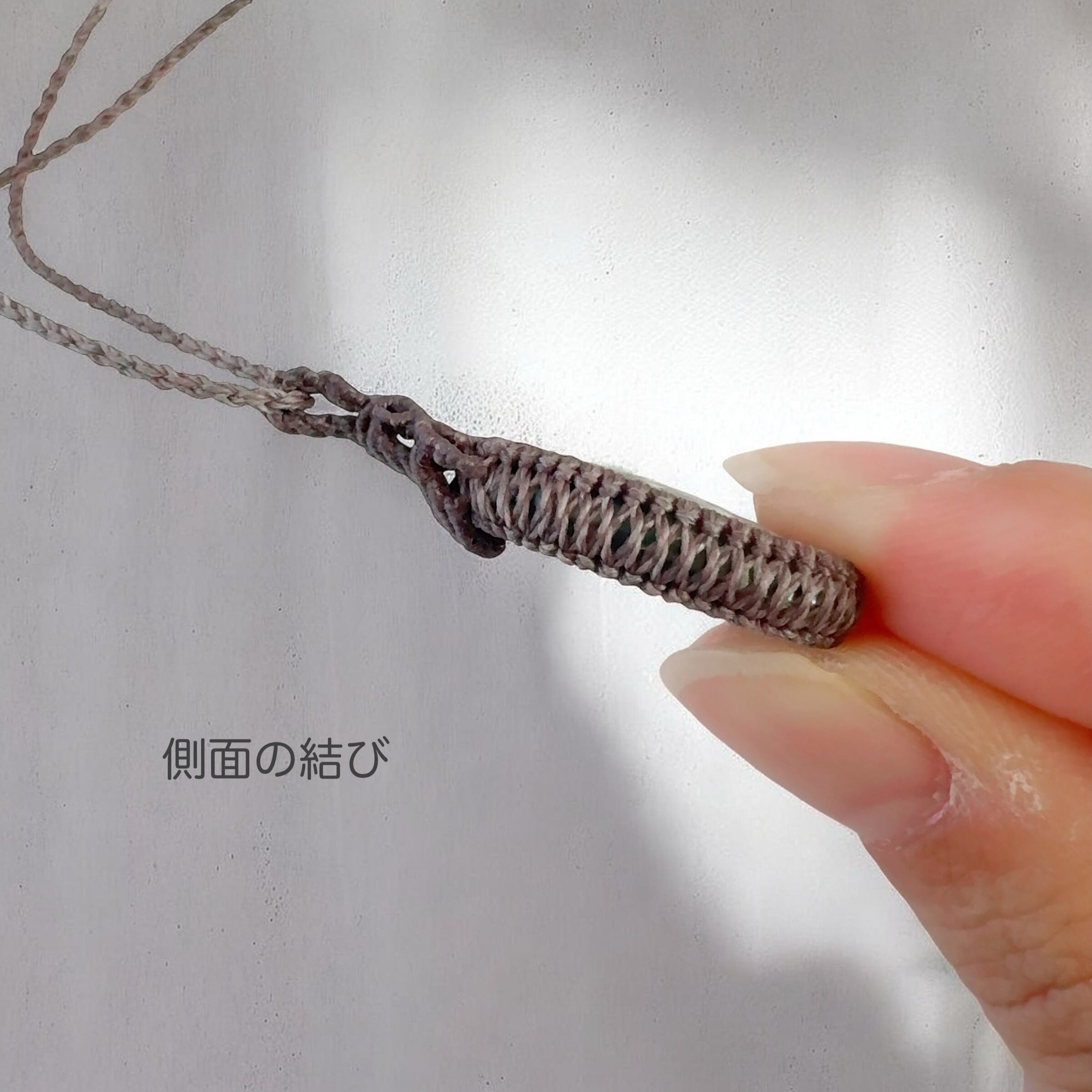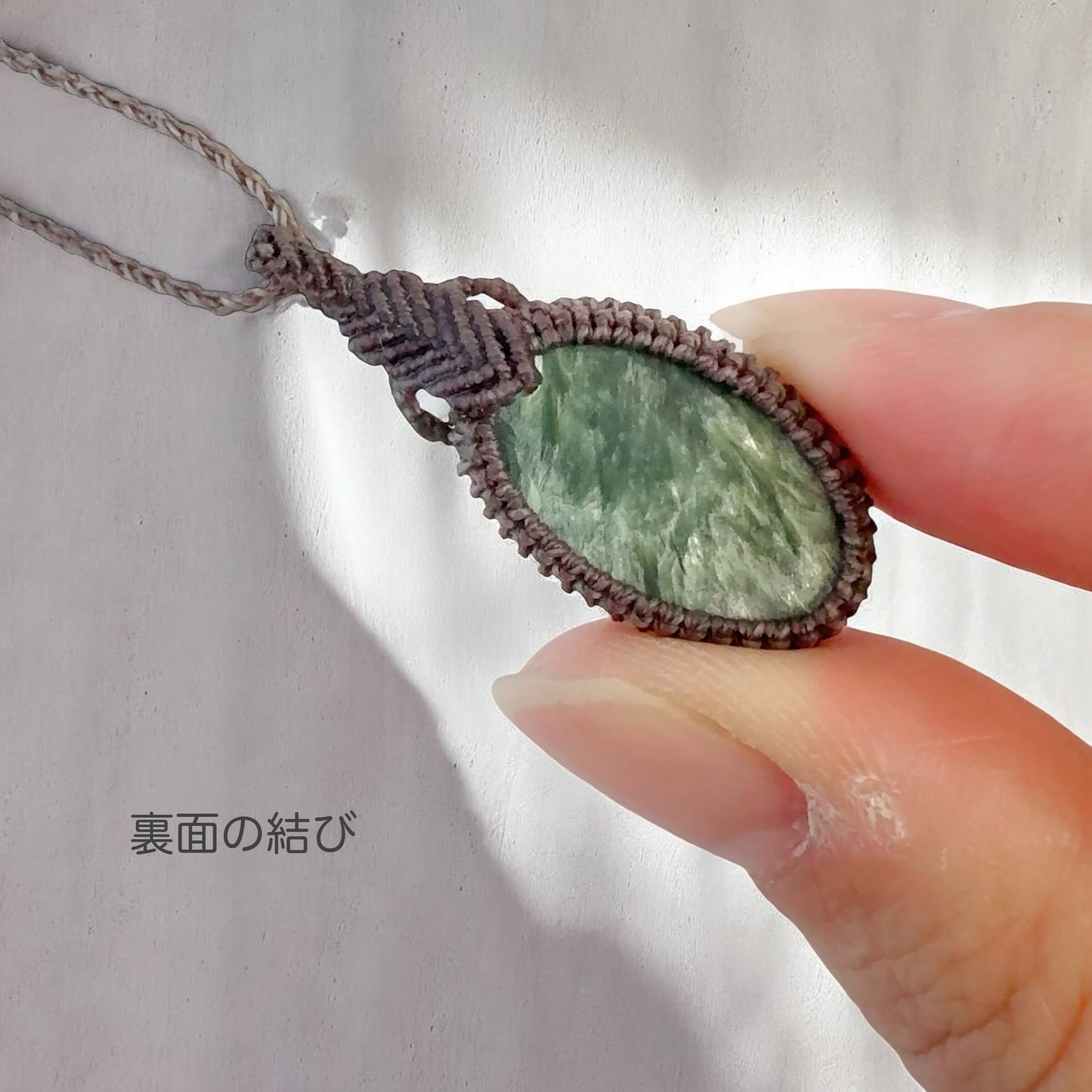 落ち着いた色味のコードで丁寧に編み上げ、石の美しさが引き立つシンプルなマクラメペンダントに仕立てました。