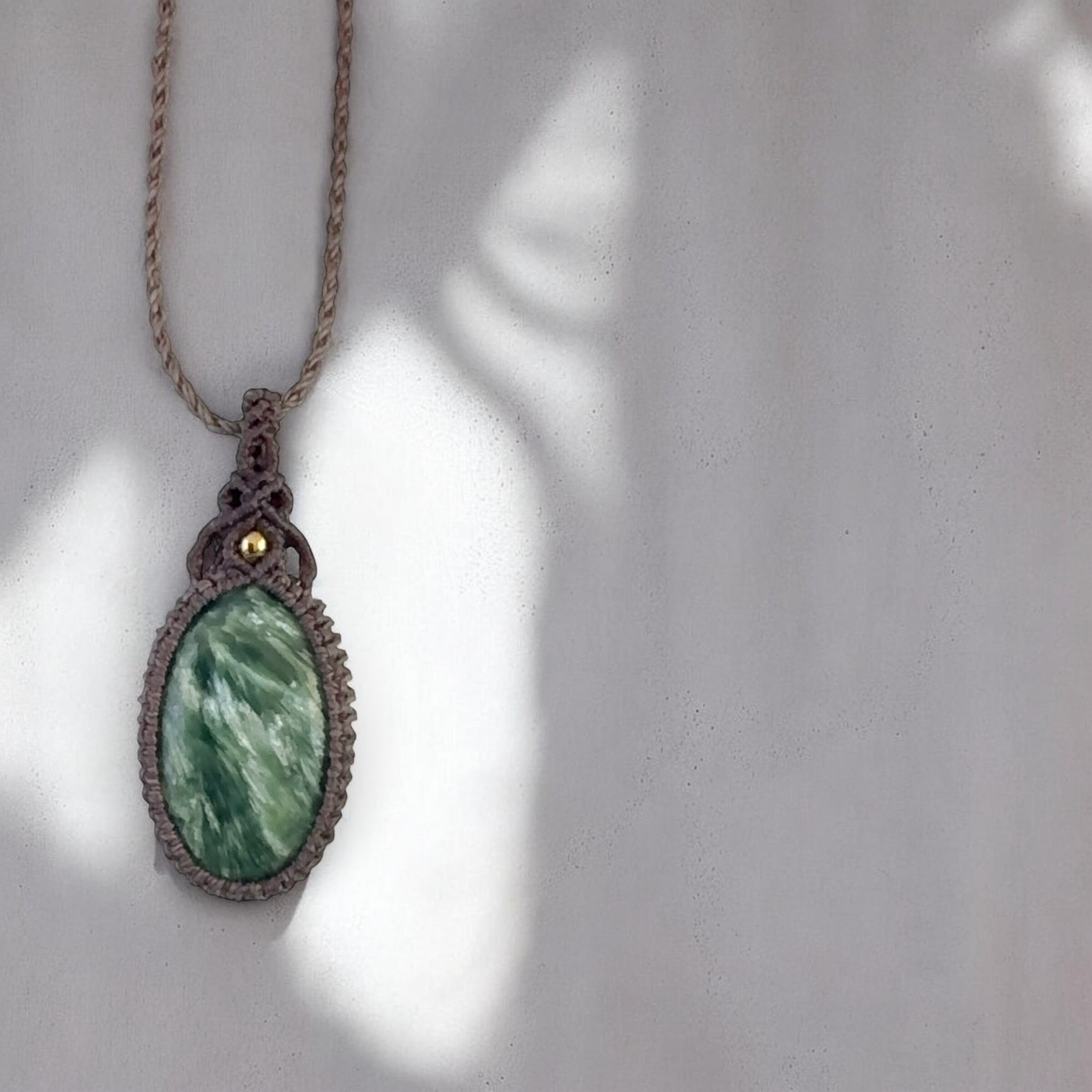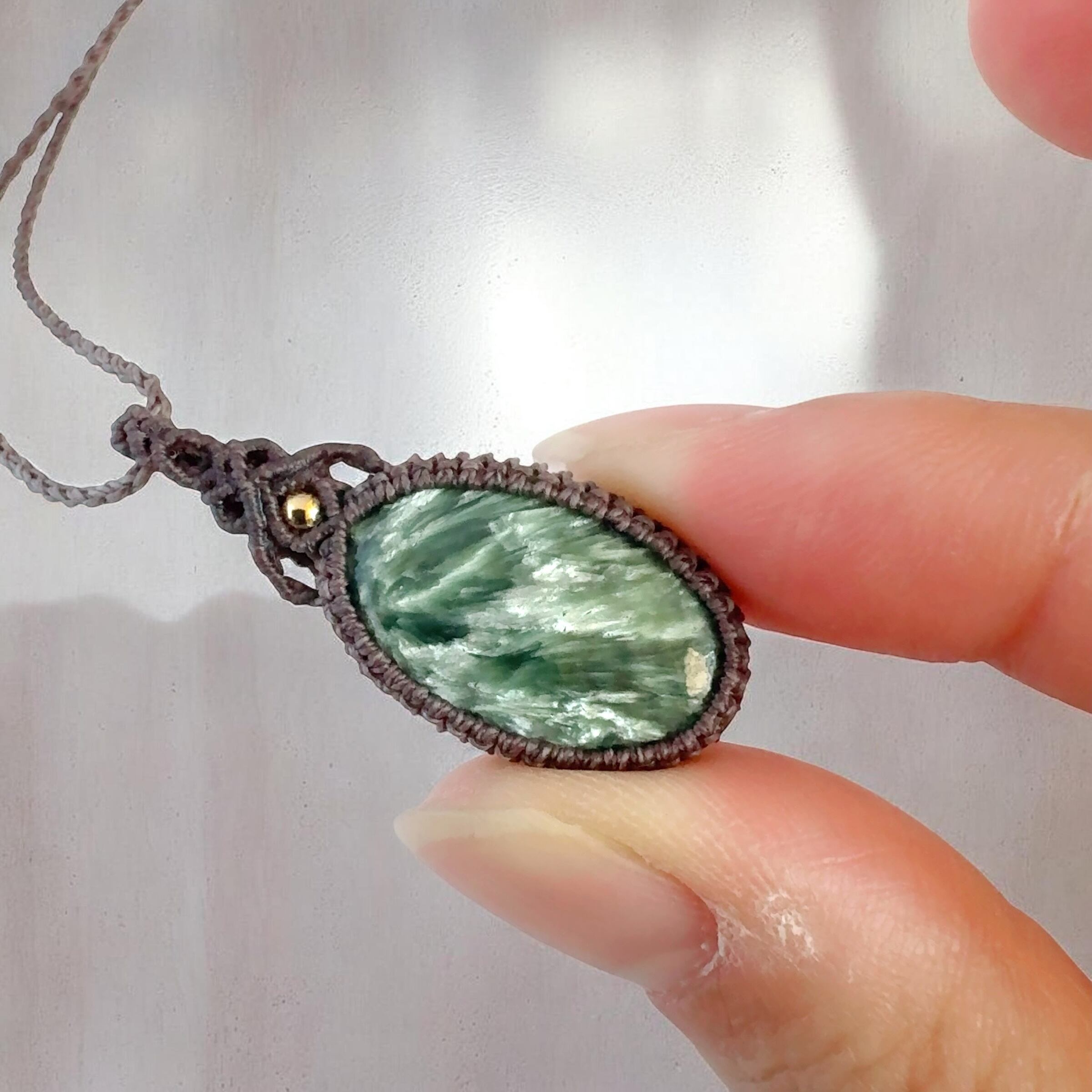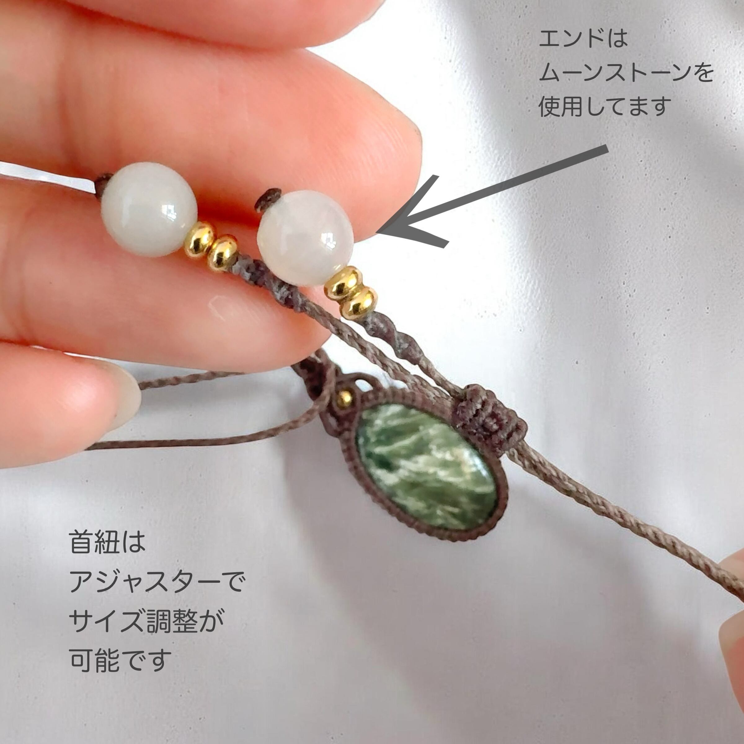 落ち着いた色味のコードで丁寧に編み上げ、石の美しさが引き立つシンプルなマクラメペンダントに仕立てました。