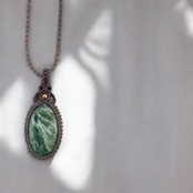 深いグリーンの中に、羽のような光沢が広がるセラフィナイト。