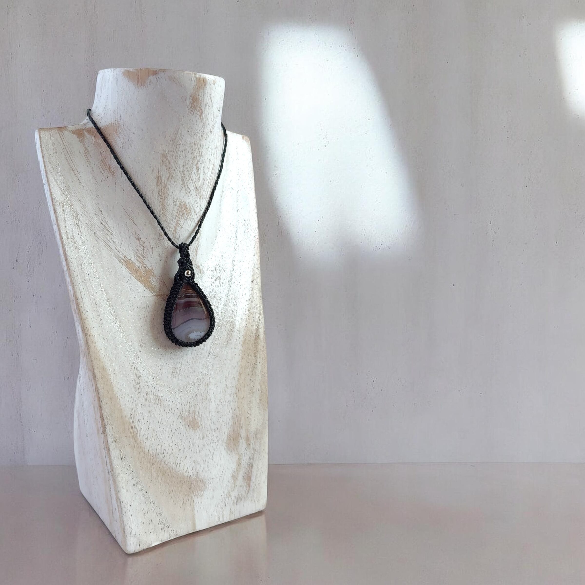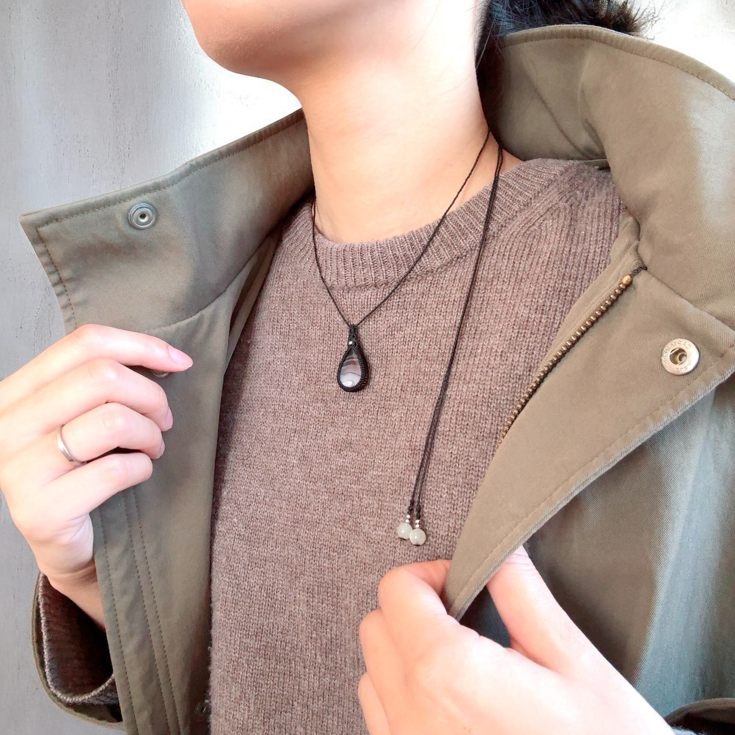 やわらかな層を重ねた、ティモールアゲートのマクラメネックレス。