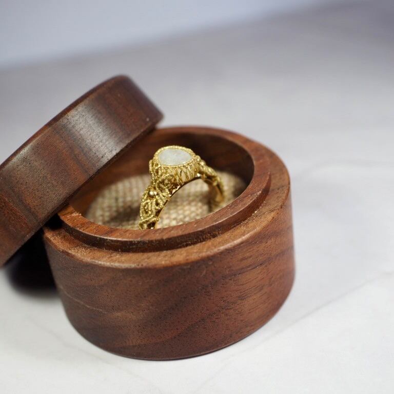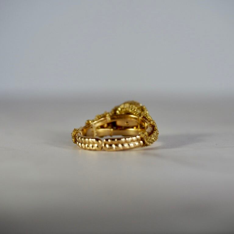 石の雰囲気に合わせて、華やかな色味のゴールドコードで丁寧に編み込み、少し金属らしい印象に仕上げました。